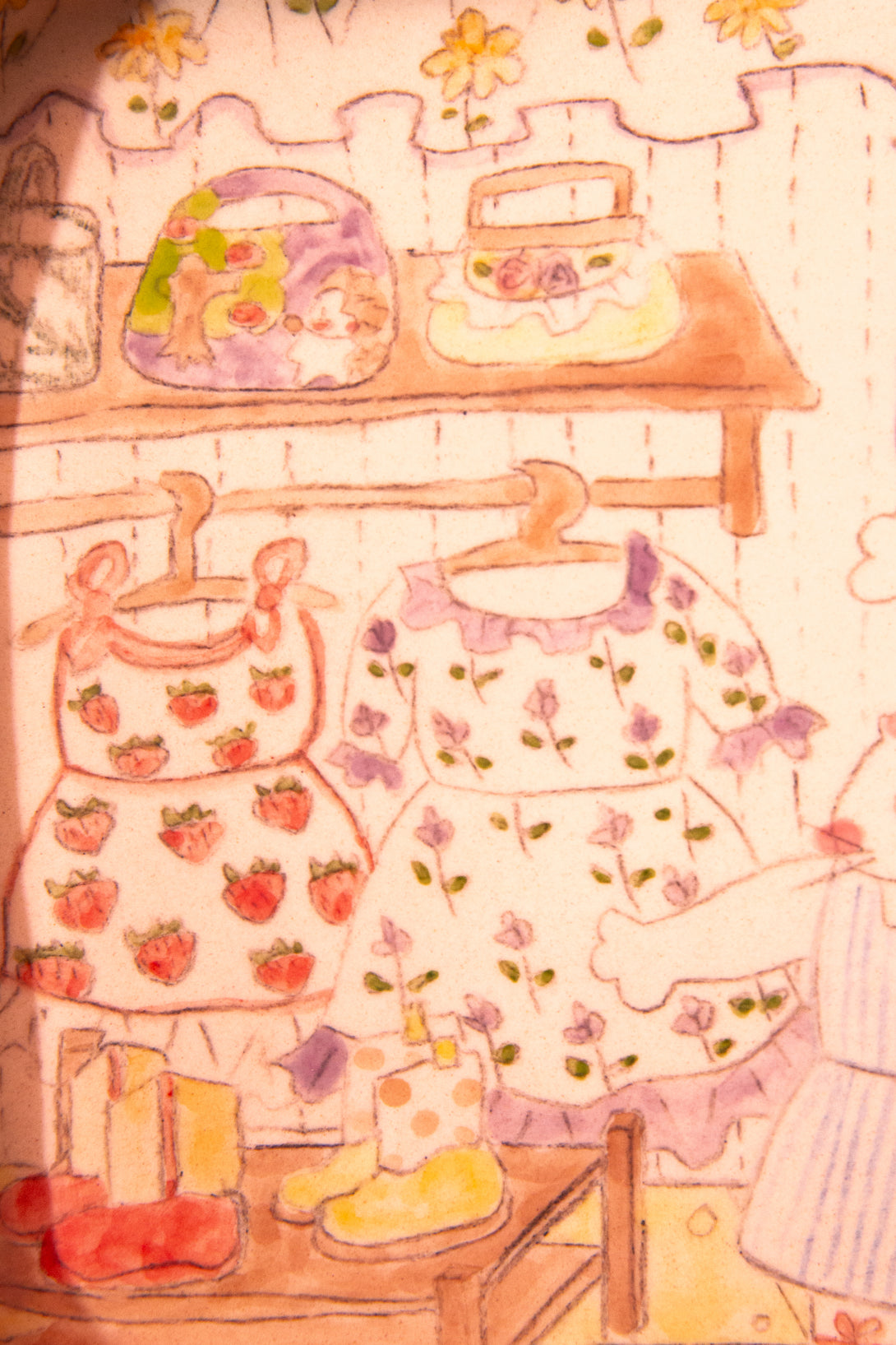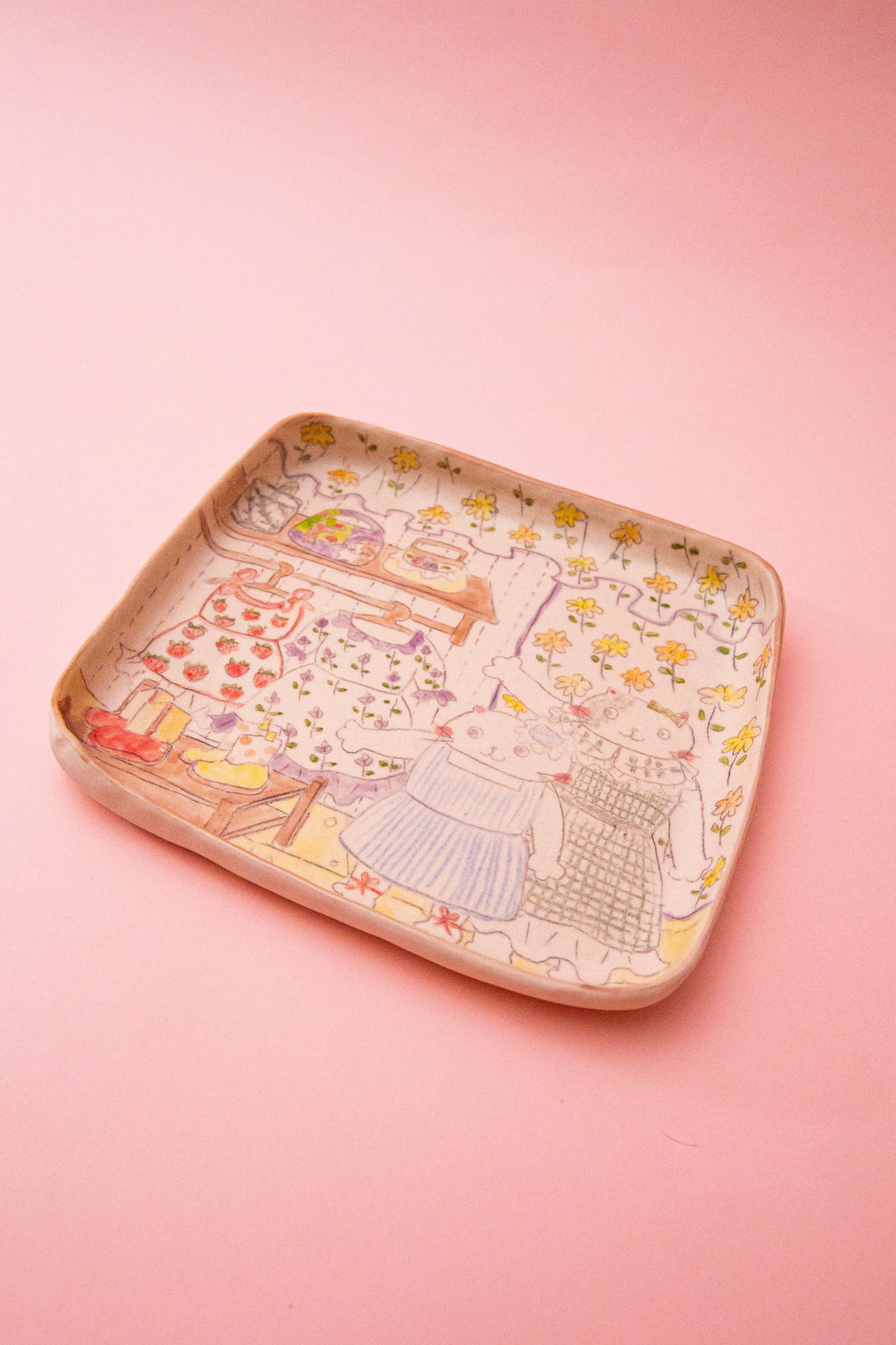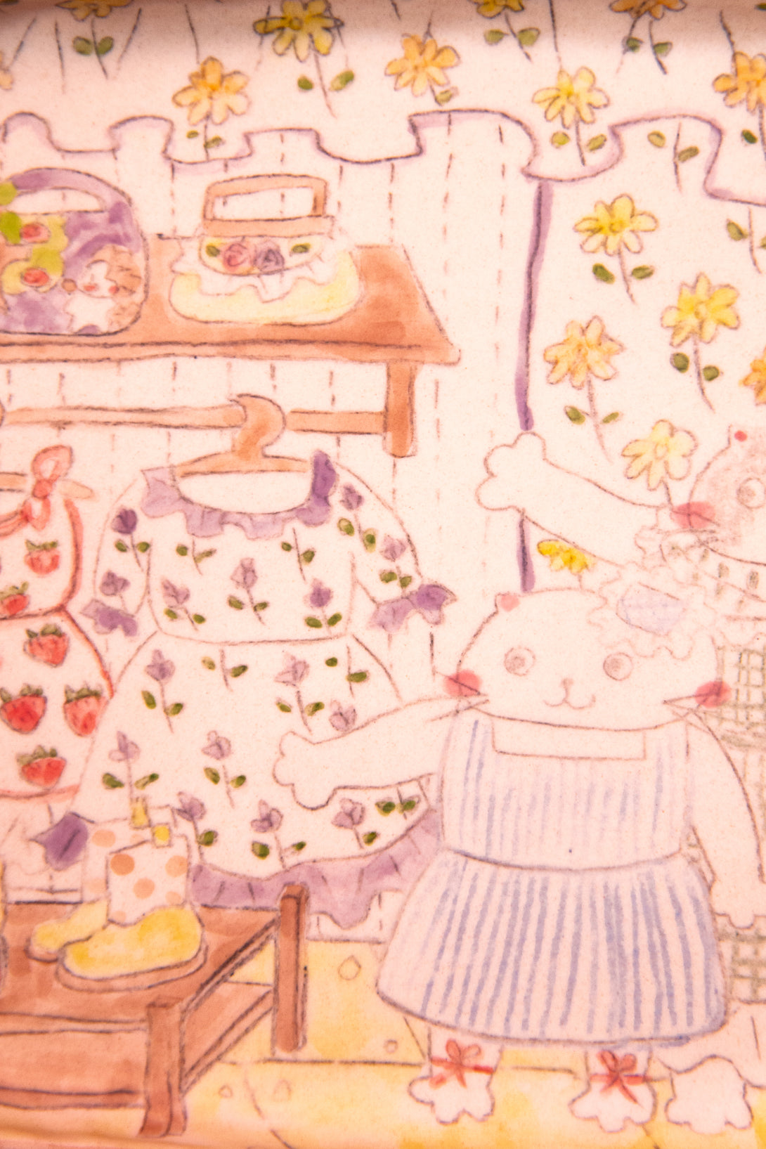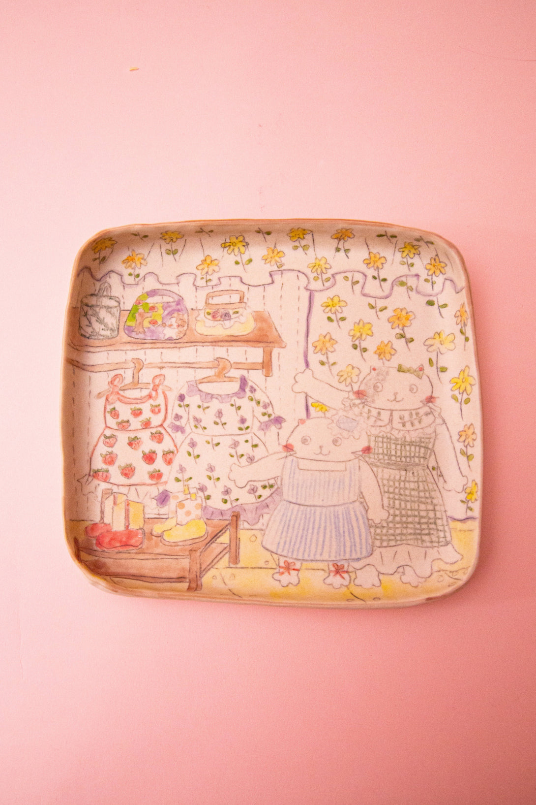 - Fully hand-illustrated plate featuring two cats trying on dresses in a sunlit, flower-covered shop.