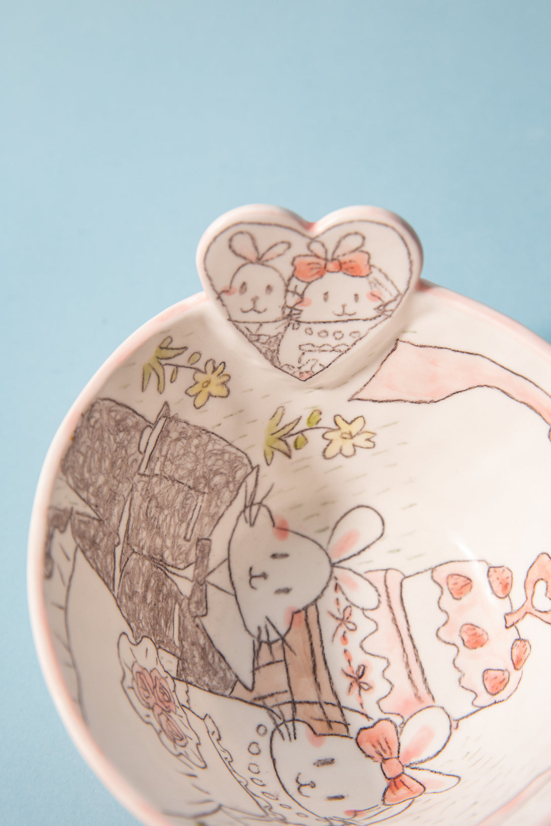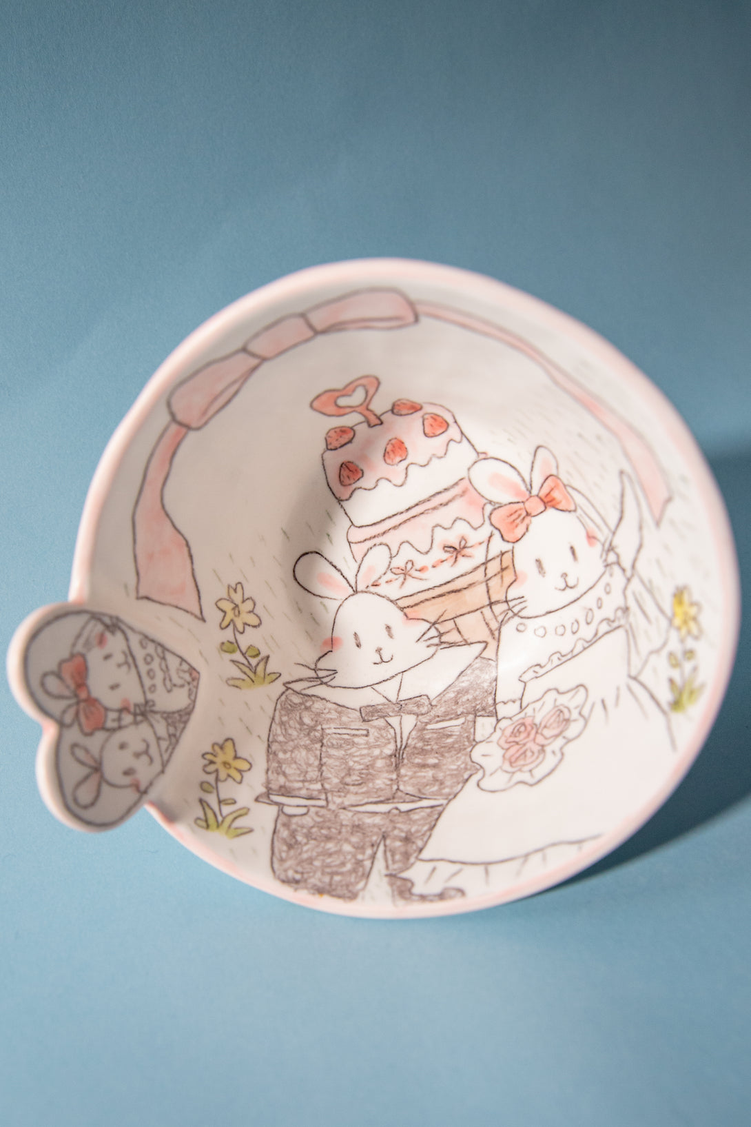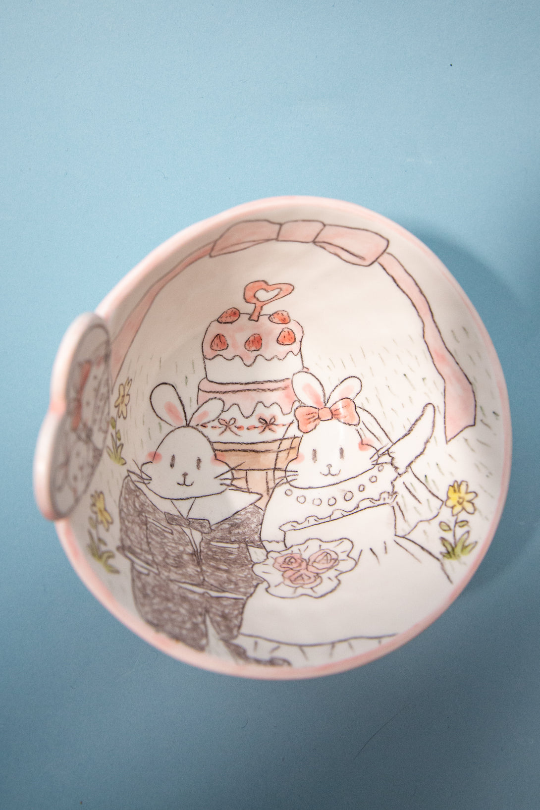 - Hand-illustrated bowl featuring a sweet rabbit wedding scene with a bride, groom, and tiered cake inside the bowl.