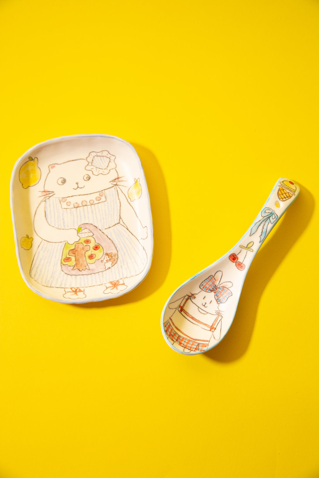 • One-of-a-kind design featuring a hand-drawn cat in a striped dress holding a hand bag. Lemons float around the edges, giving this piece a gentle warmth.
