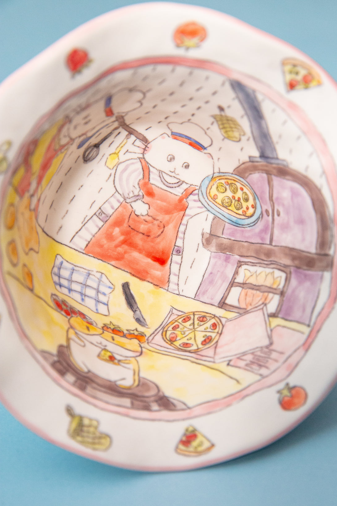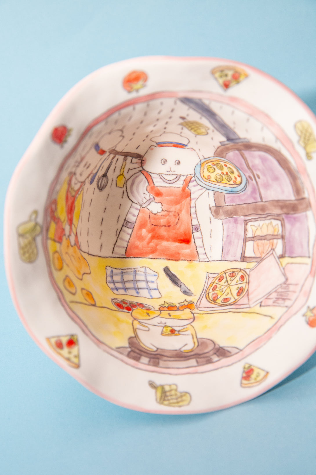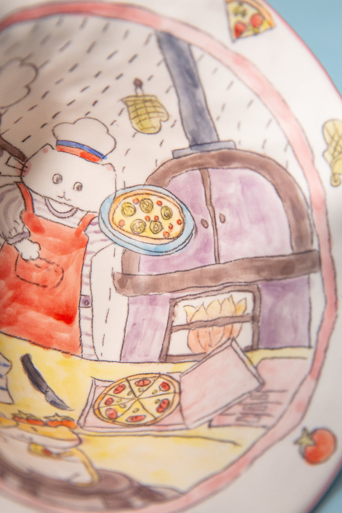 - The rim is decorated with playful designs of pizza slices, tomatoes, and kitchen tools, giving the whole piece a food-lover’s character.