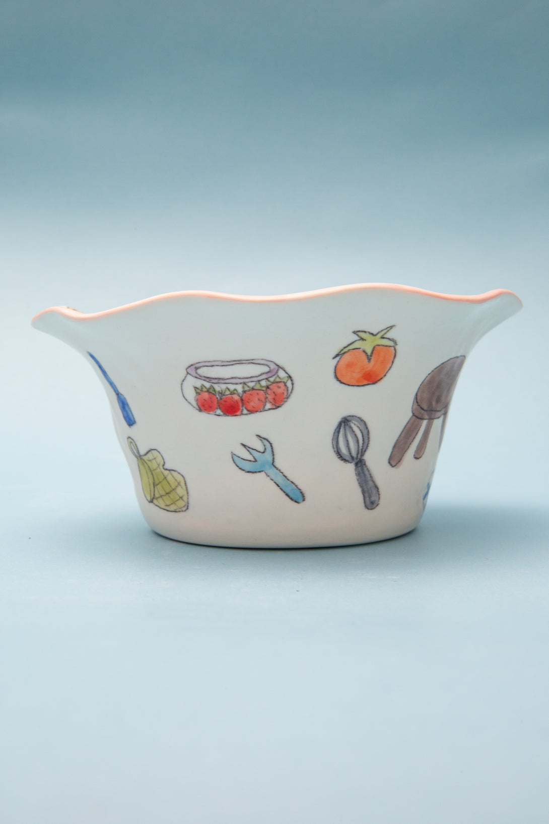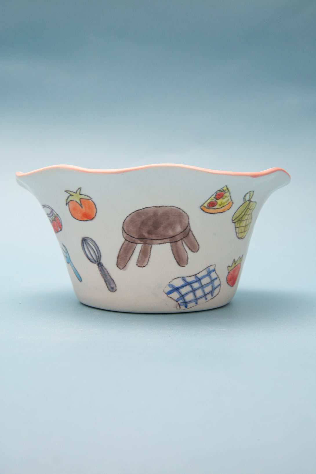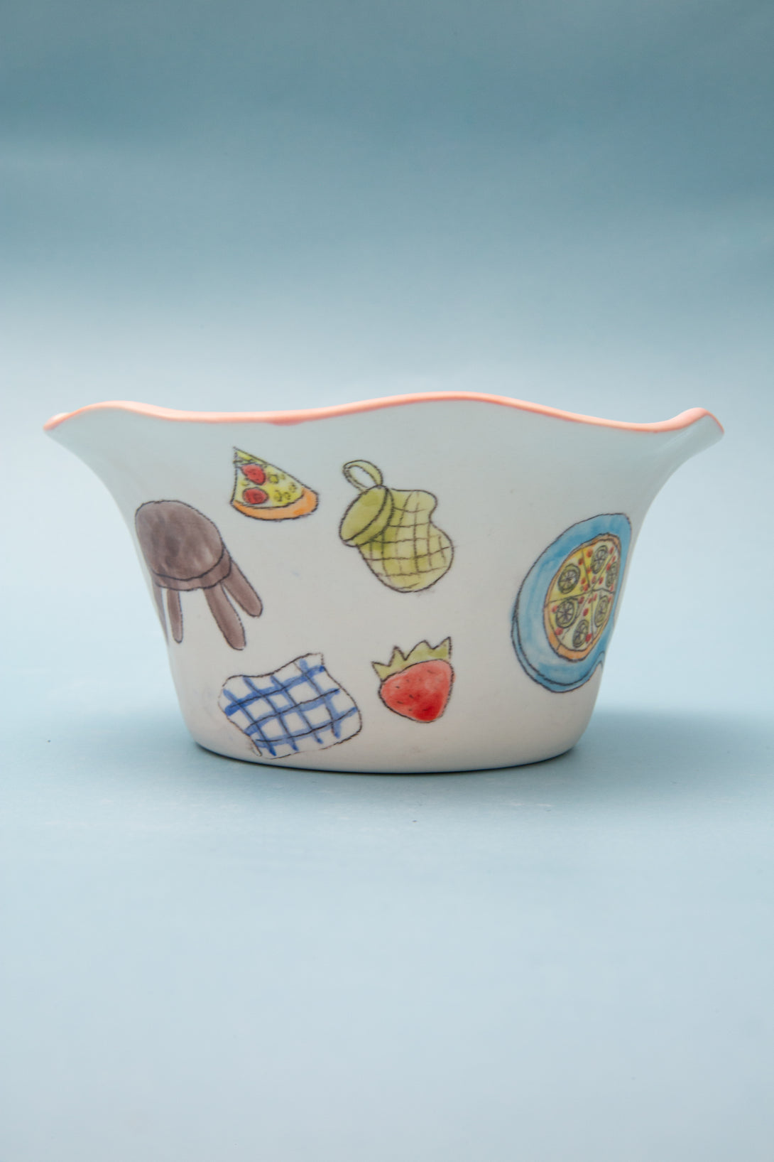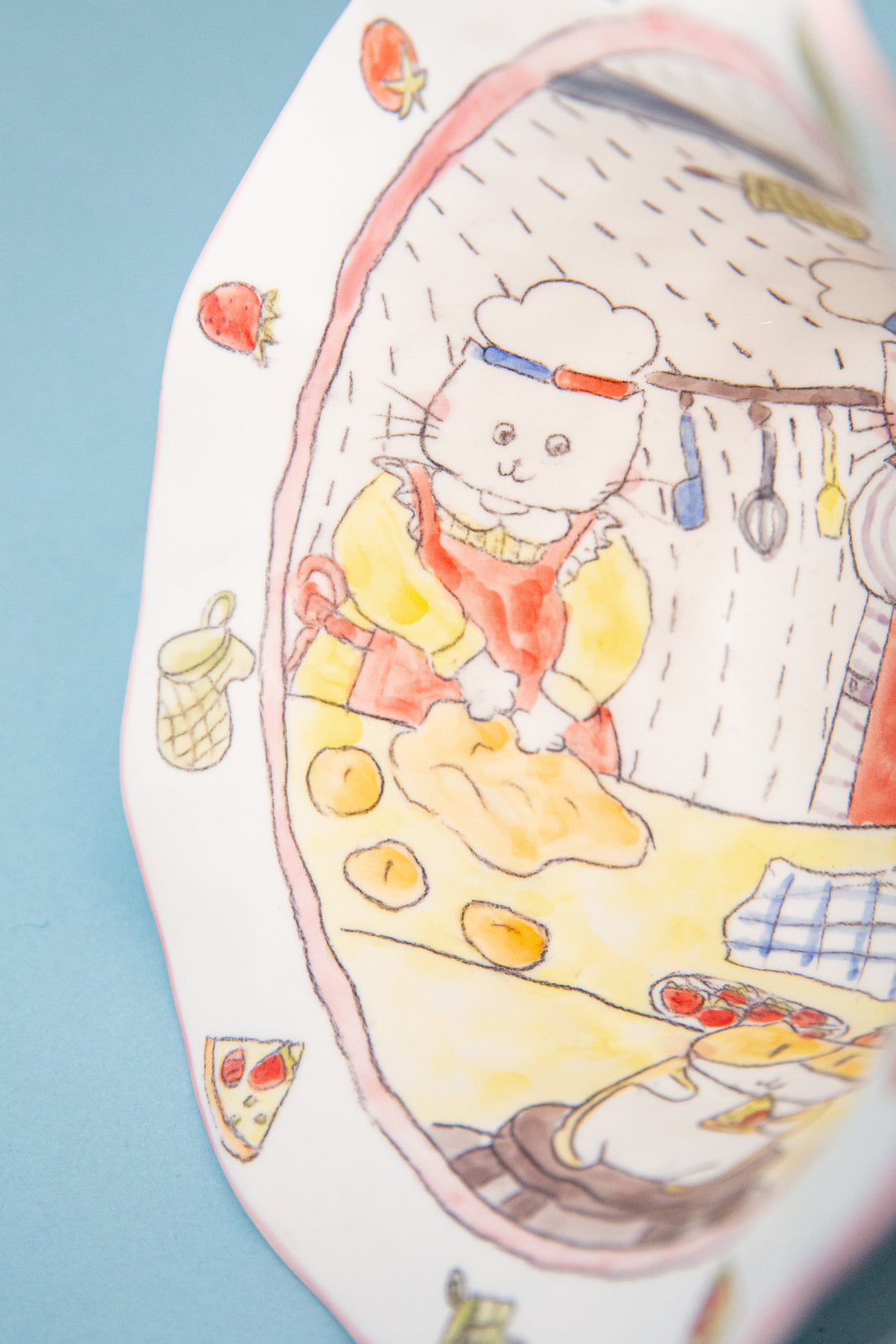 - The rim is decorated with playful designs of pizza slices, tomatoes, and kitchen tools, giving the whole piece a food-lover’s character.