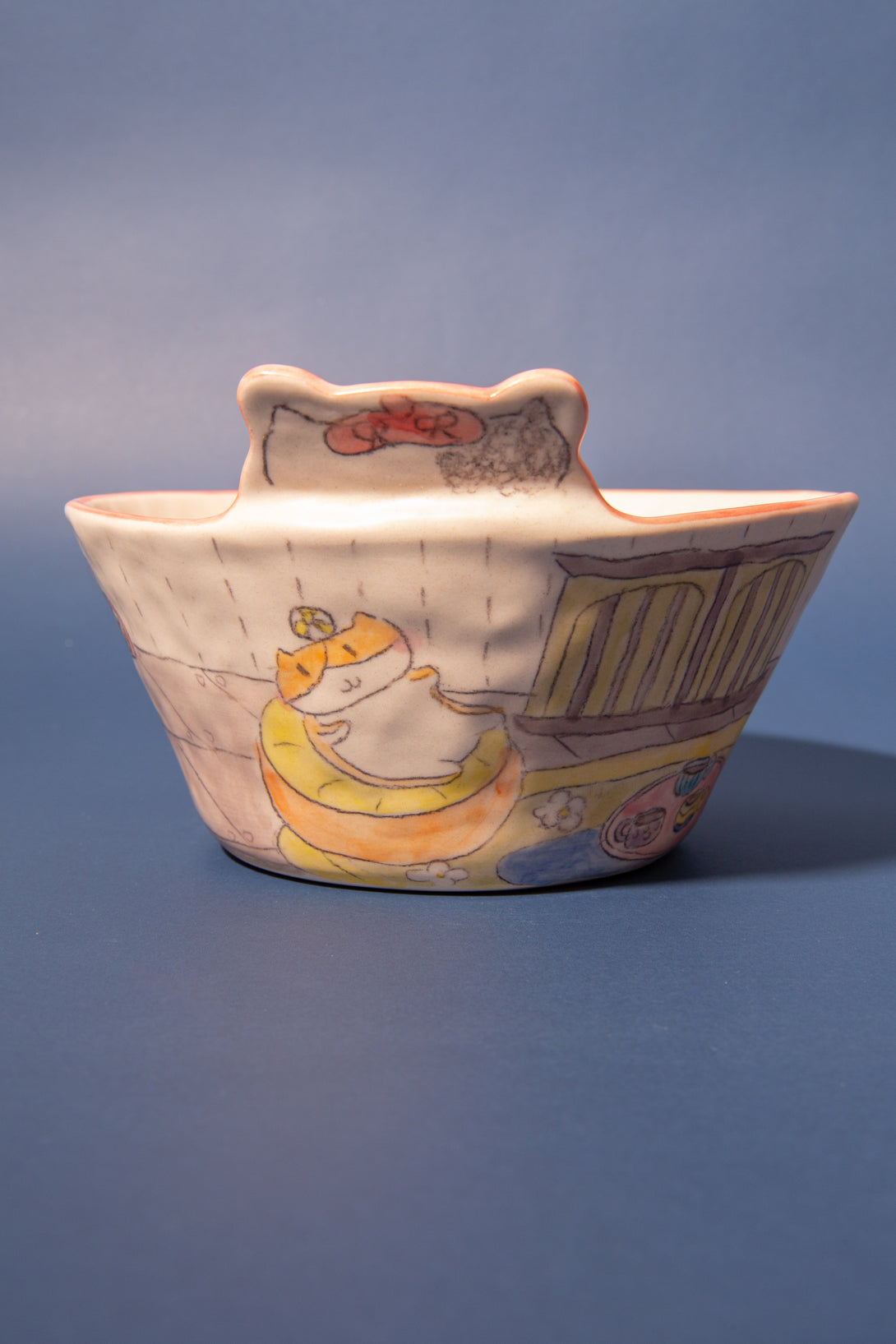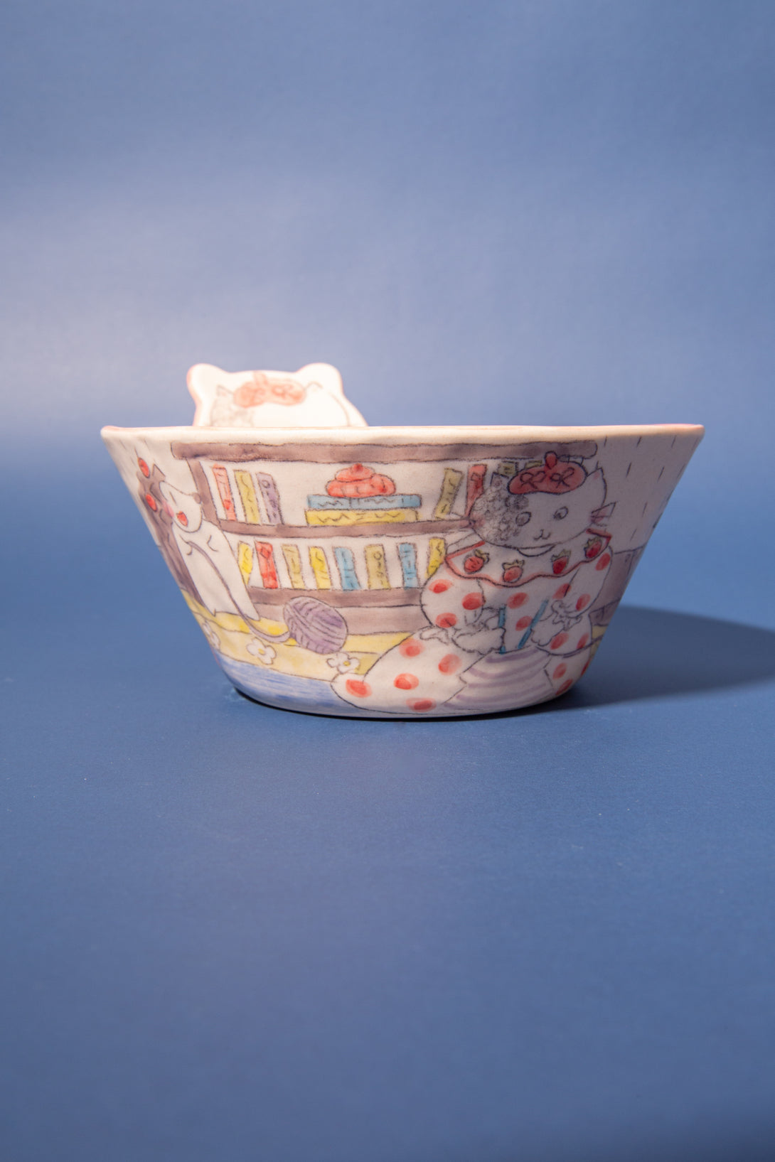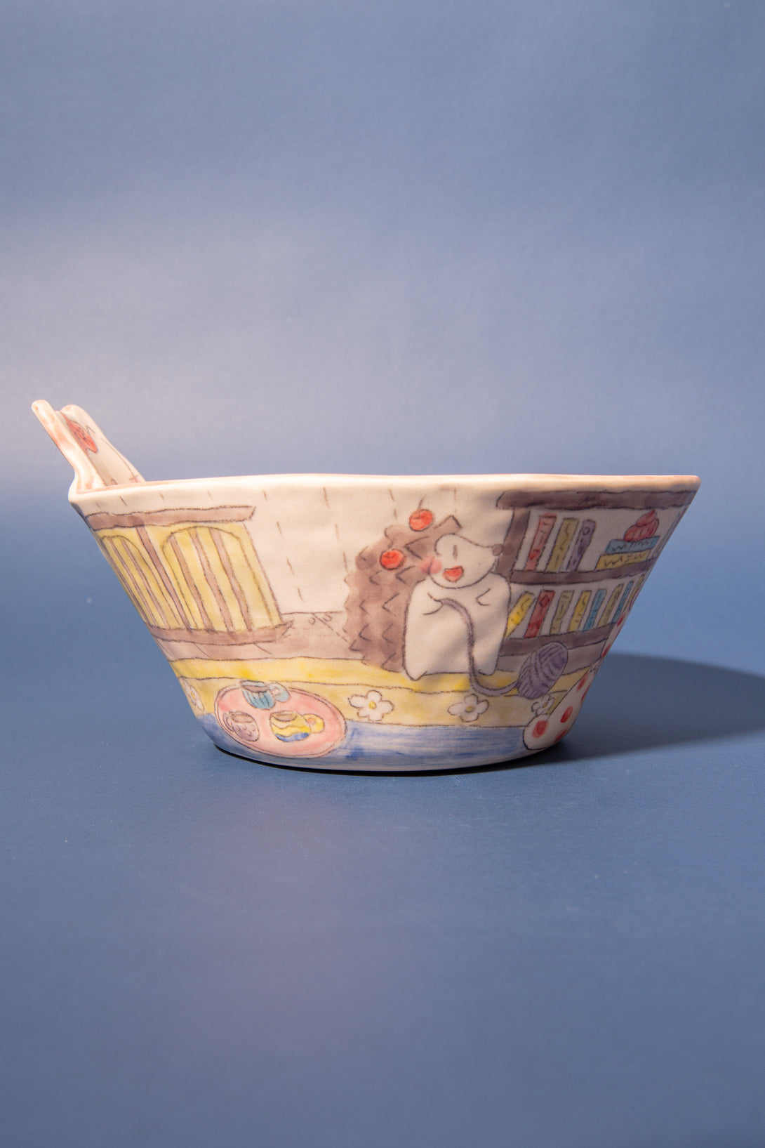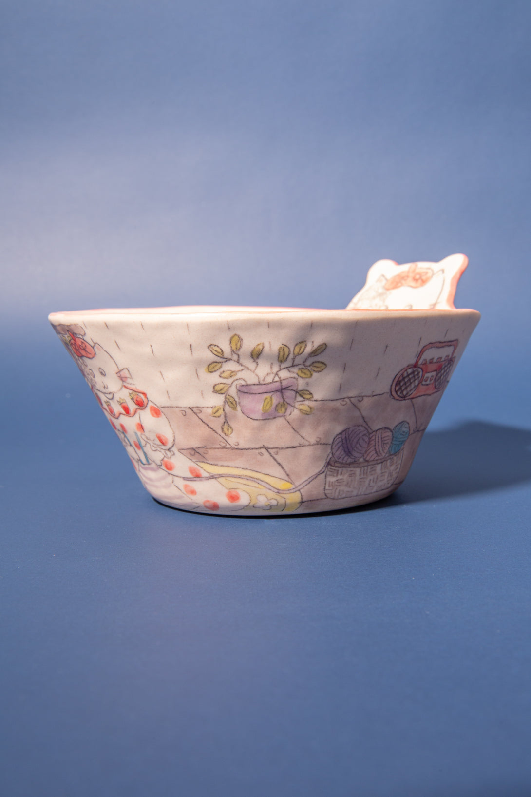 • One-of-a-kind hand-illustrated bowl showing a cosy living room scene with a cat in polka-dot outfits, yarn baskets, and playful details like bookshelves and a radio.
