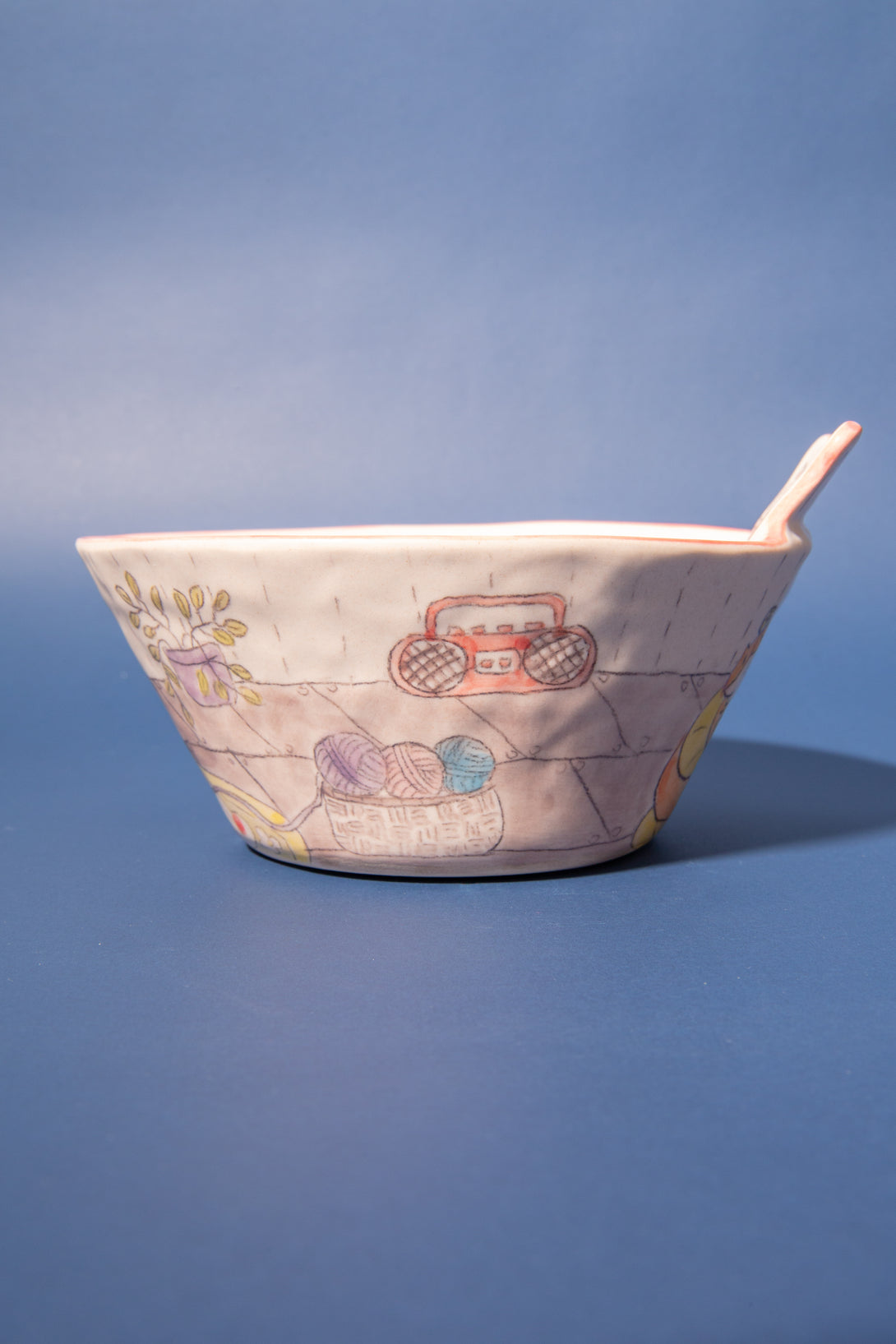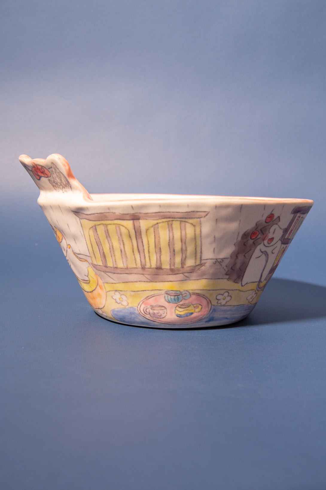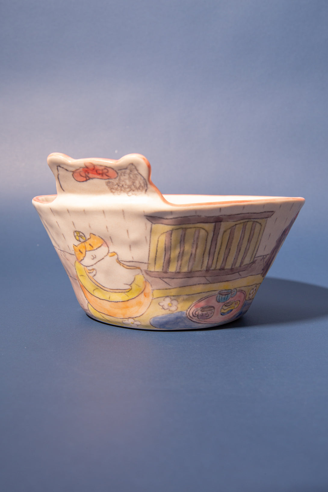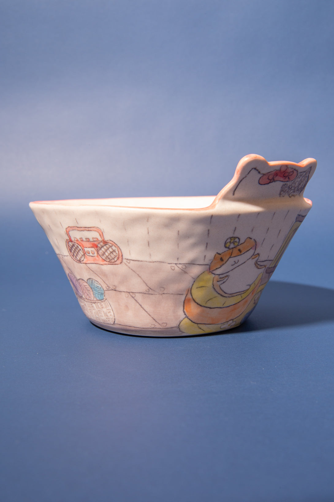 • One-of-a-kind hand-illustrated bowl showing a cosy living room scene with a cat in polka-dot outfits, yarn baskets, and playful details like bookshelves and a radio.