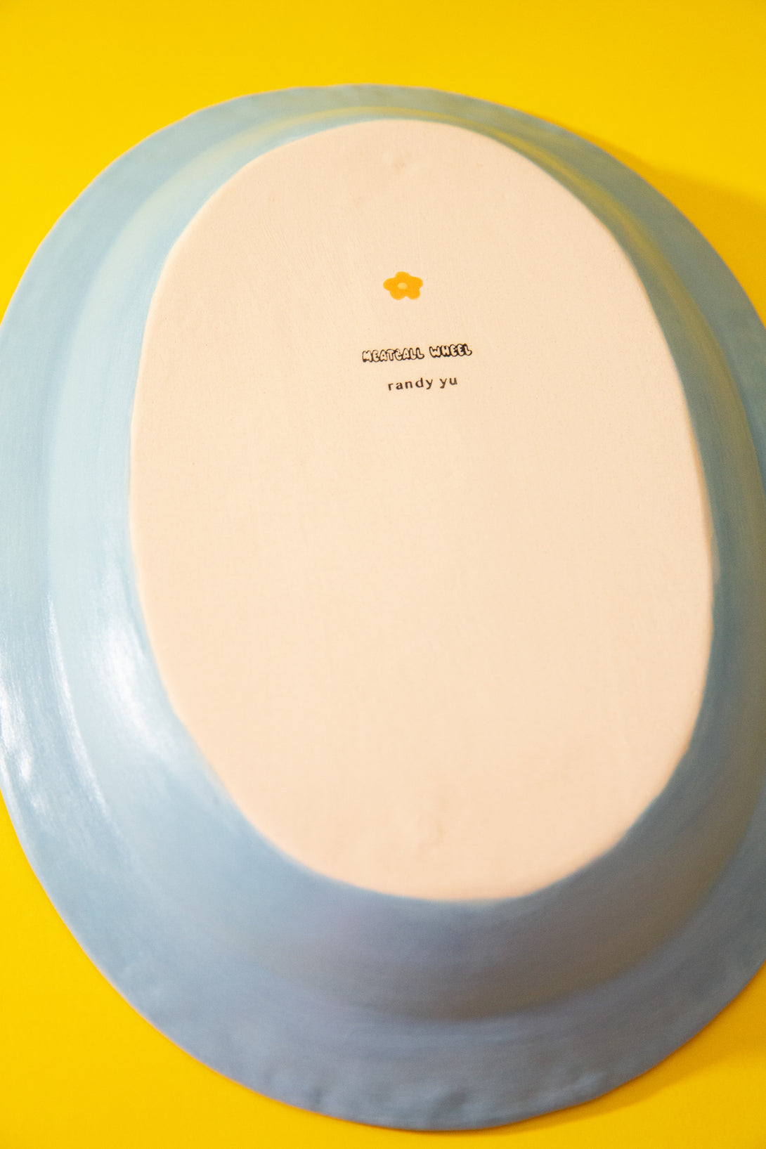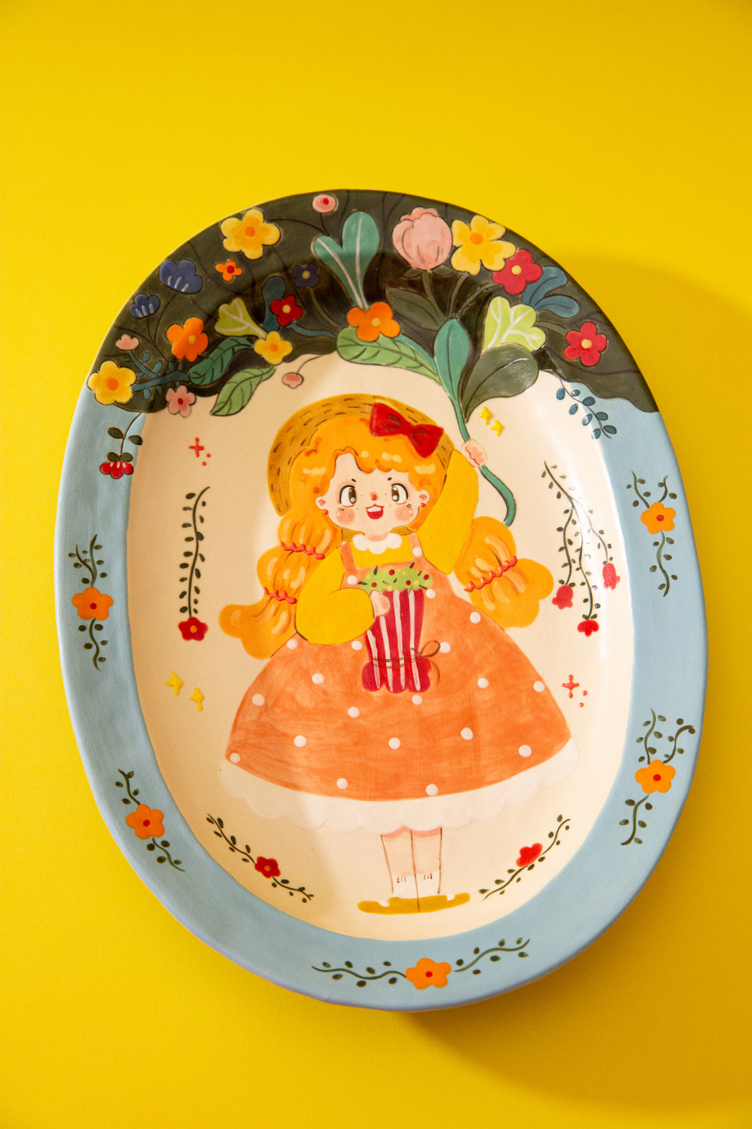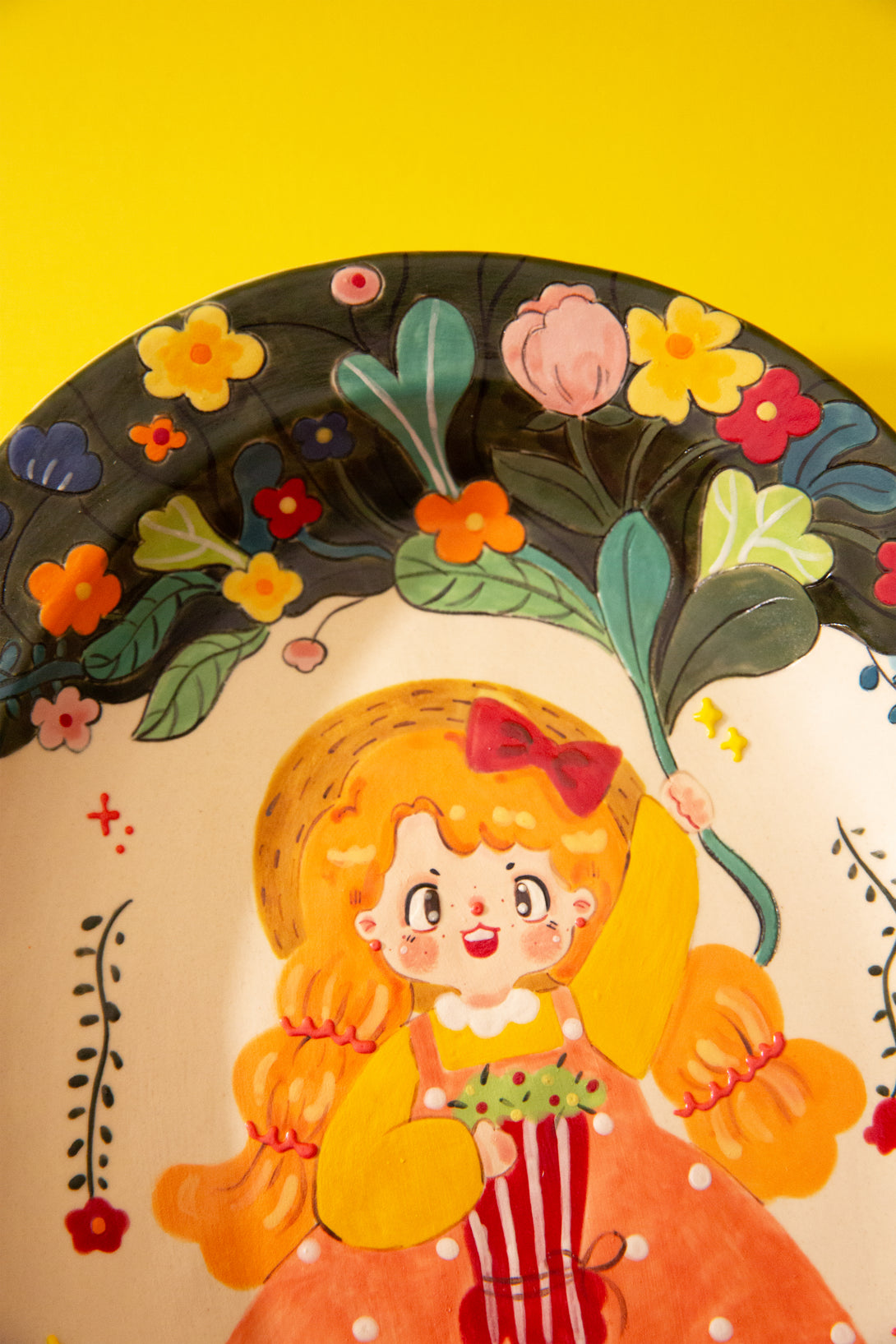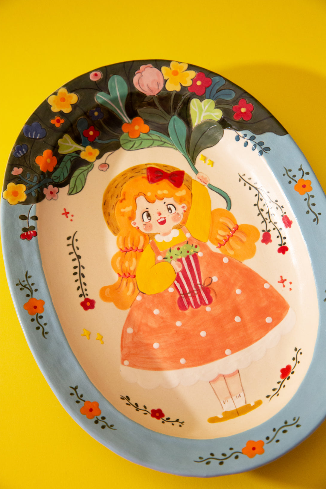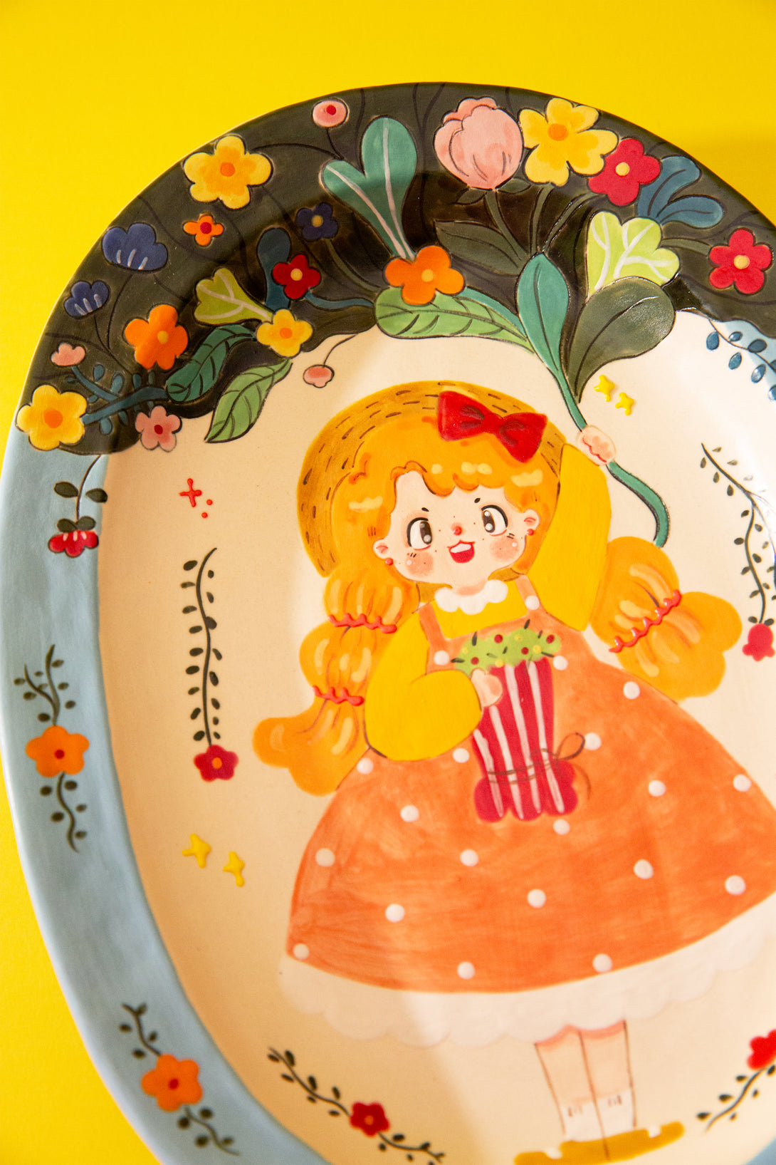 • This hand-painted ceramic serving plate is framed by a ring of flowers in bloom. Carved and raised details give the motifs a 3D tactile dimension, turning the illustration into something you can feel as well as see.