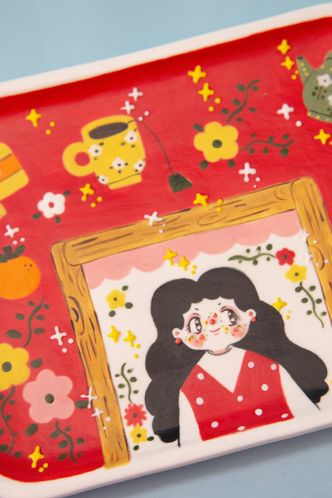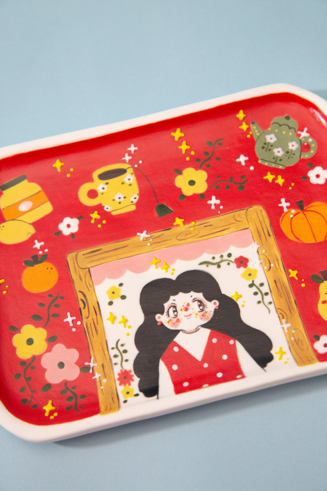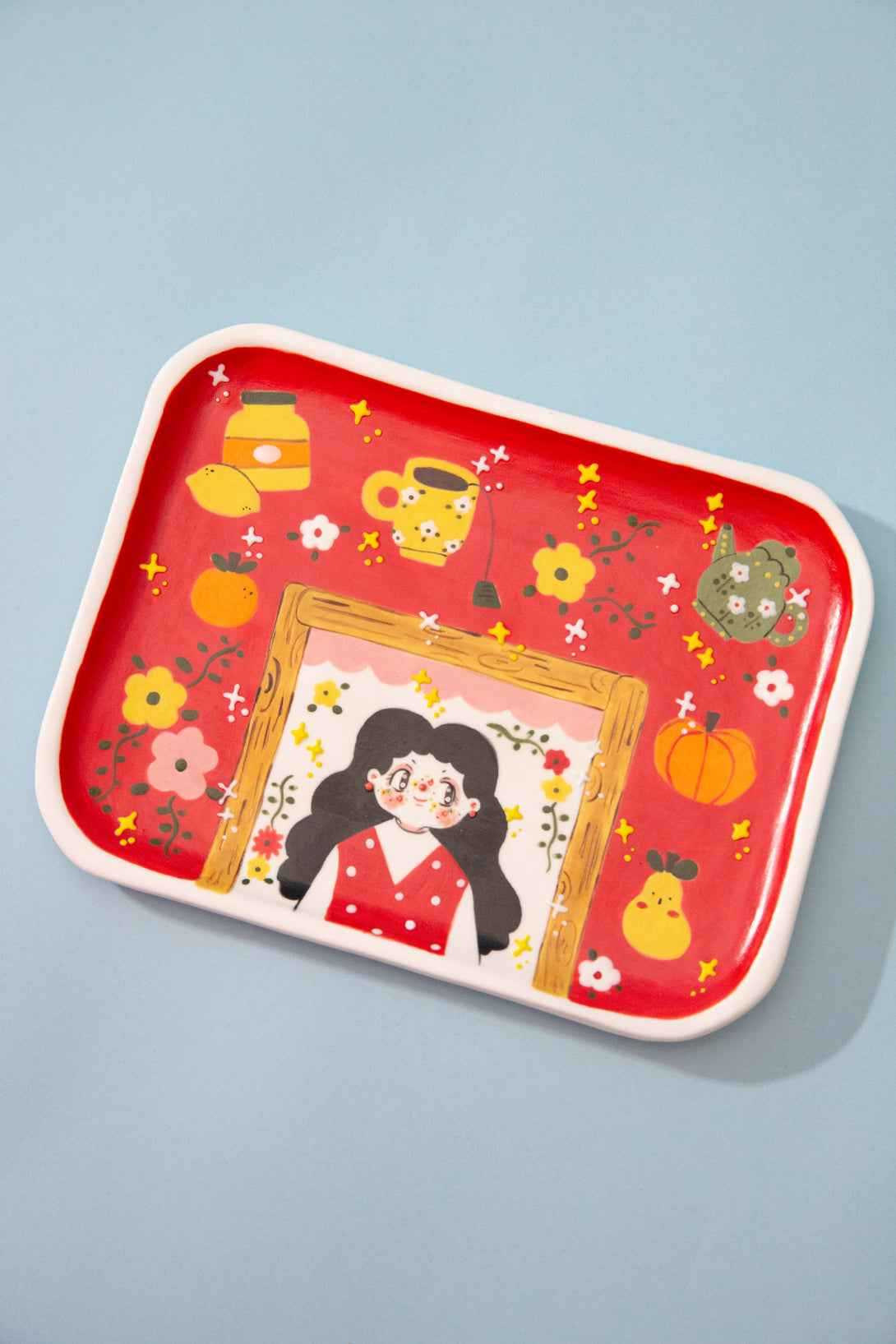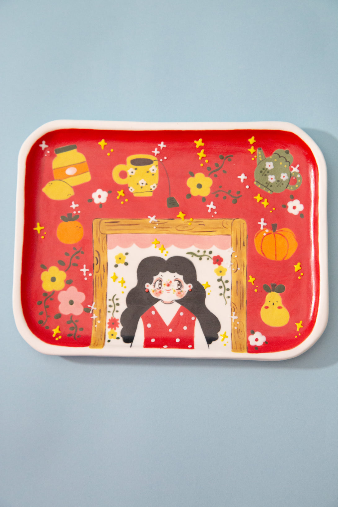 A bold ceramic plate with a hand-painted red backdrop and playful motifs. Perfect for serving snacks, displaying fruit, or as a tabletop accent. A bright pick for birthdays, new homes, and everyday hosting.