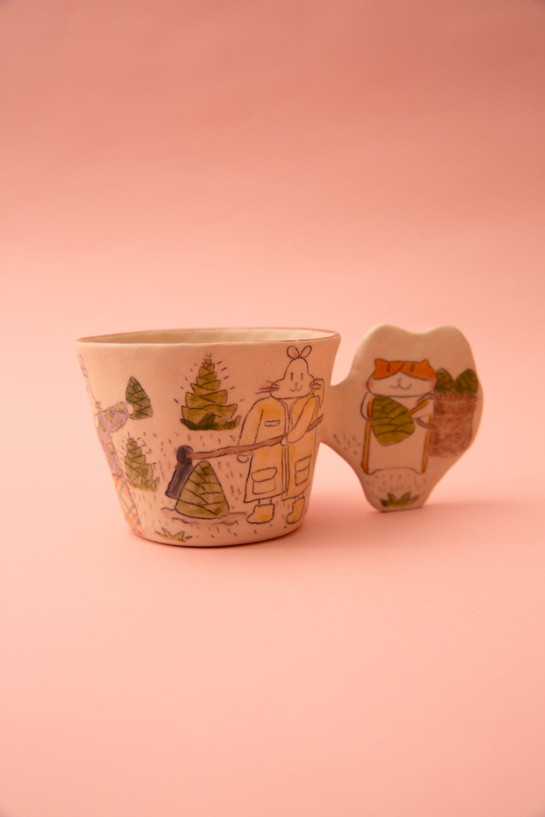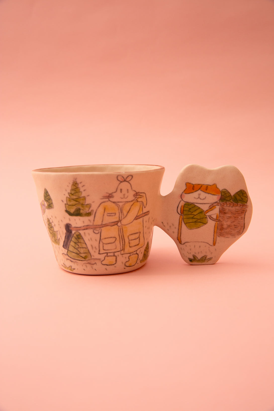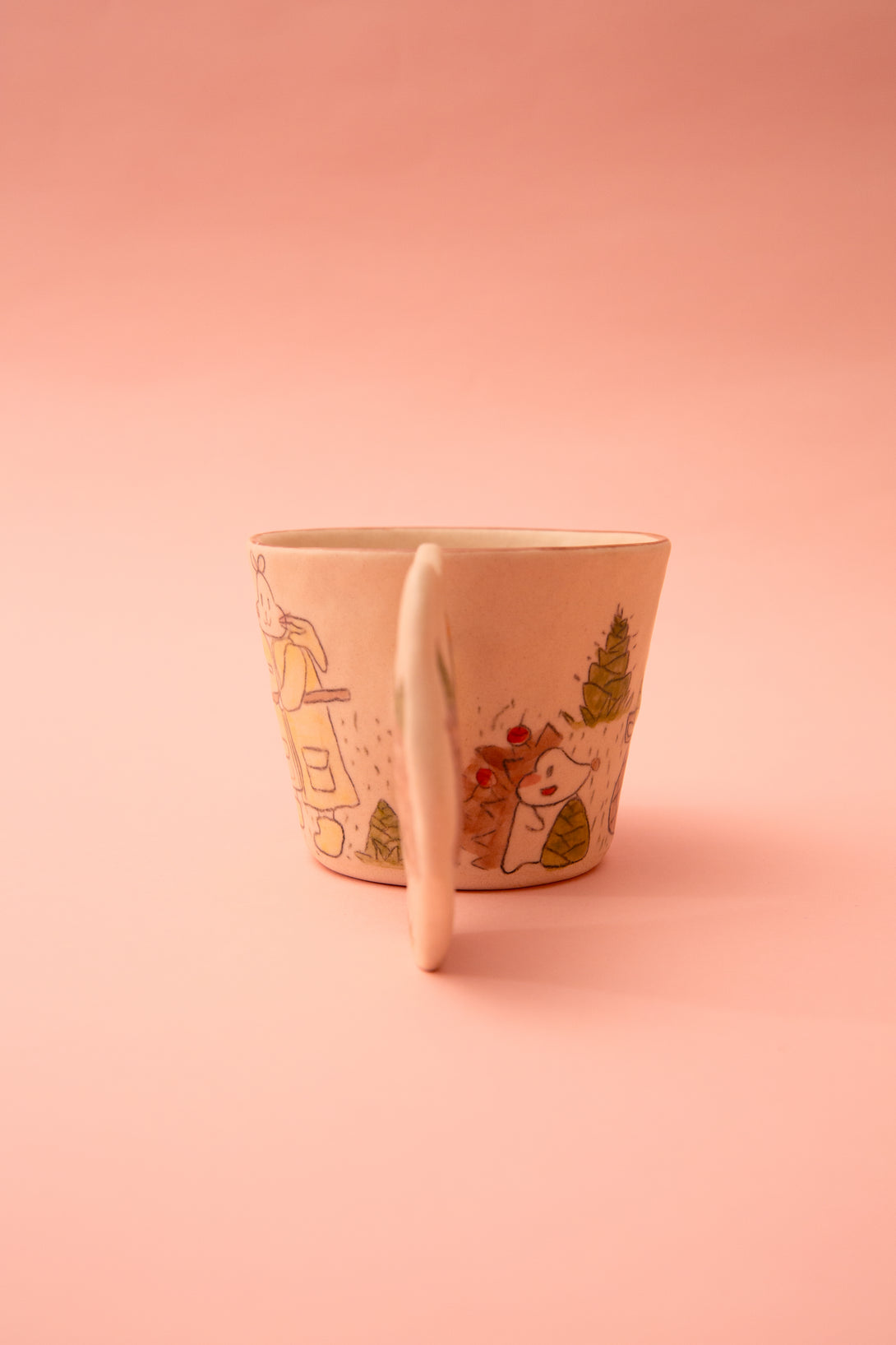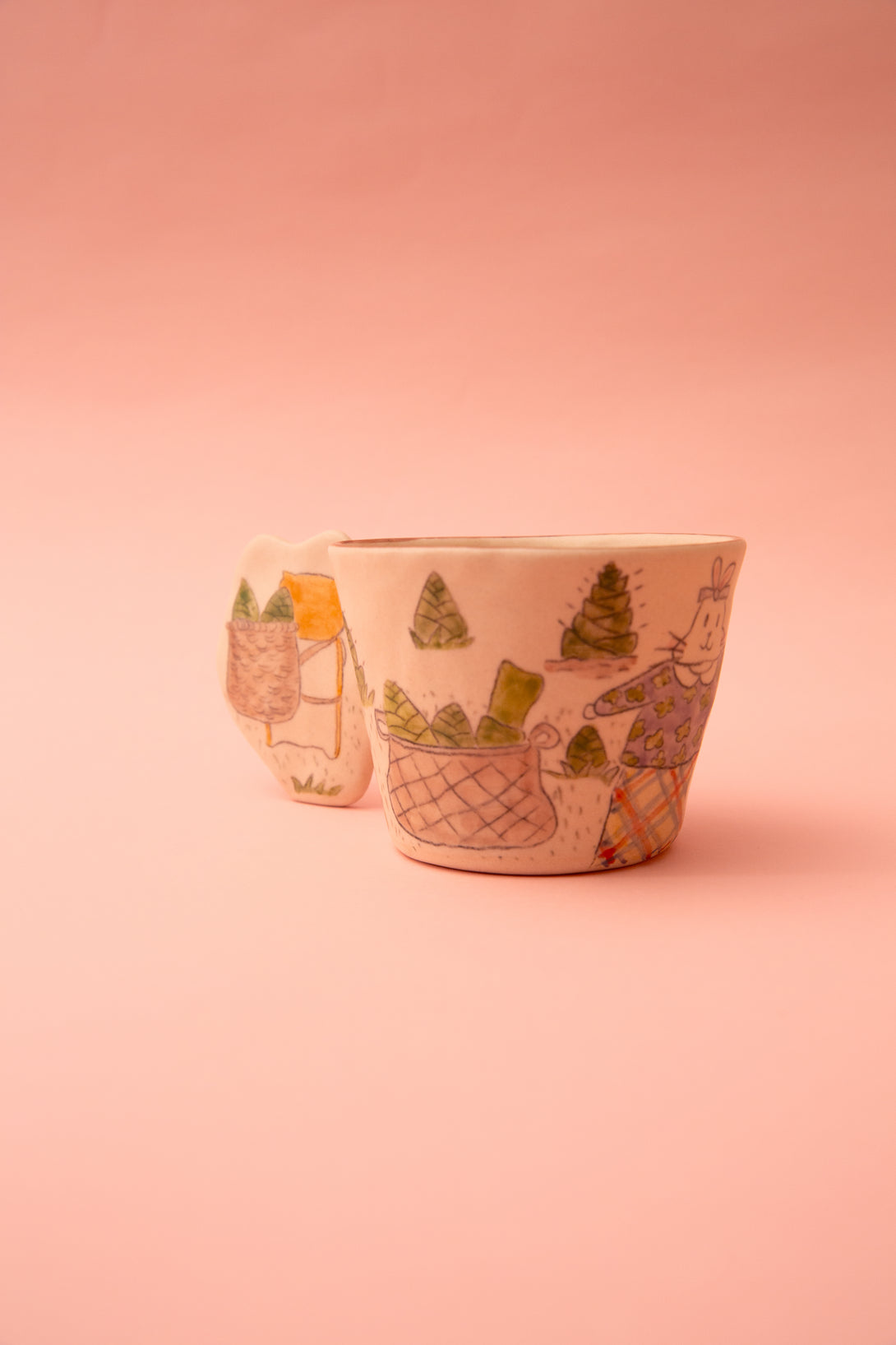 • A mug that features a full wraparound illustration of a rabbit family on a cheerful forest outing – one wears a yellow coat, another a purple sweater with flowers, baskets of greenery in tow.