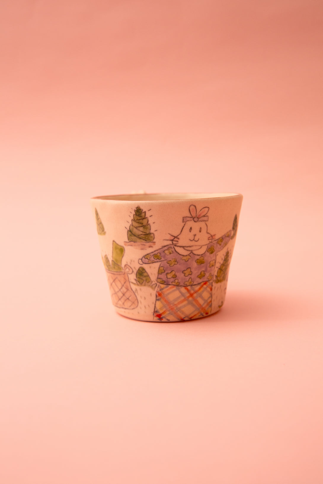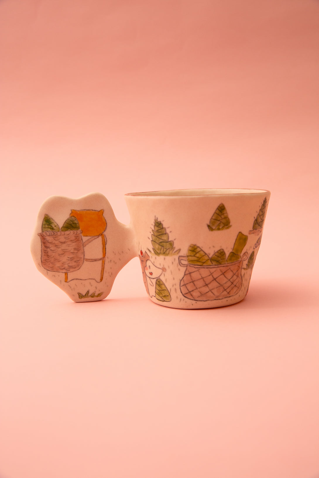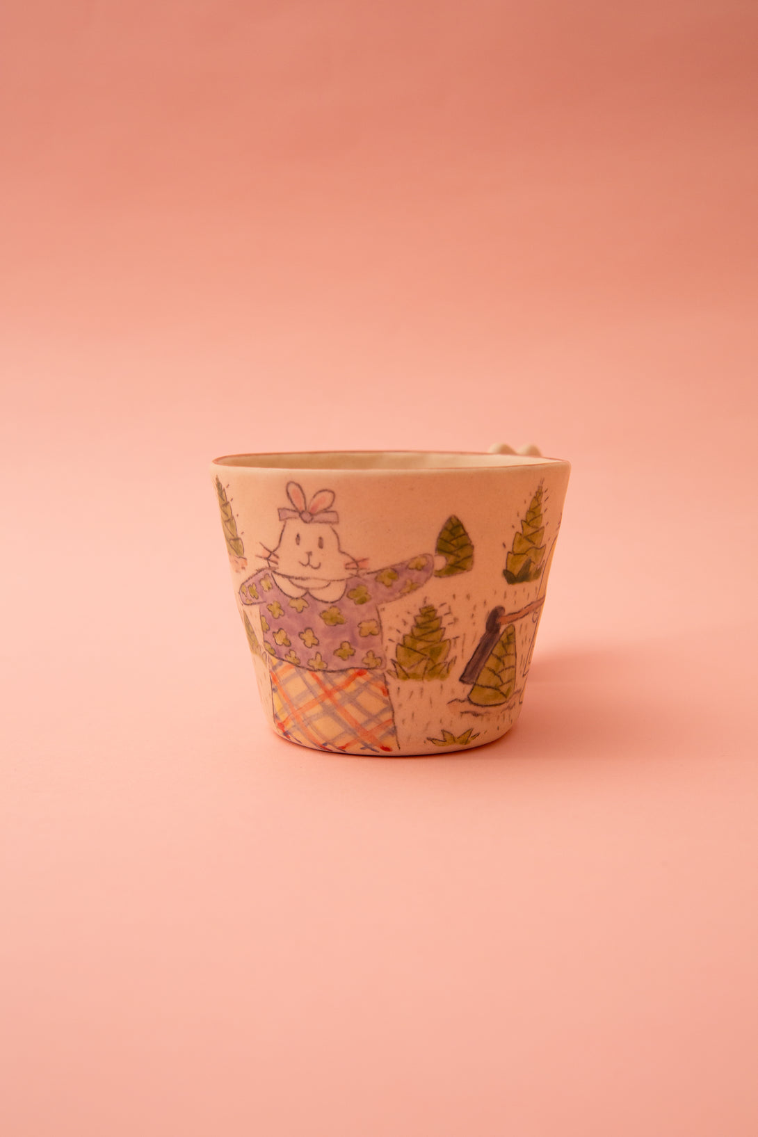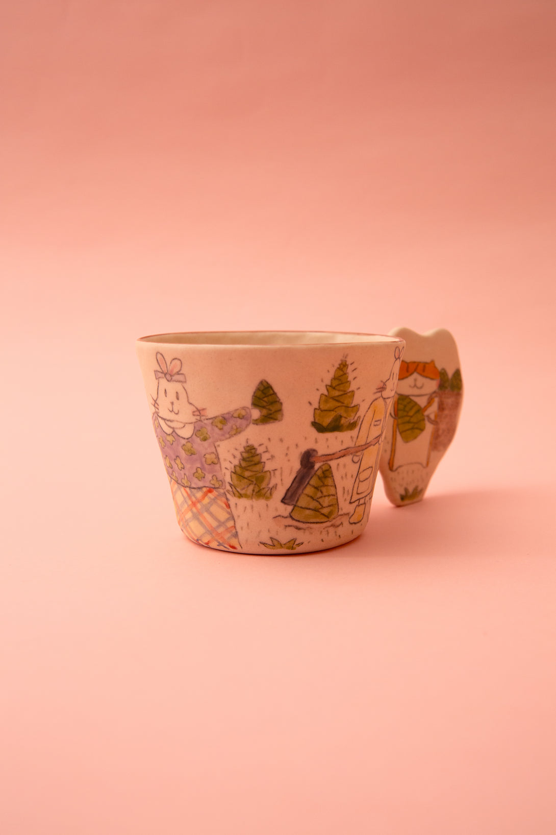 • A mug that features a full wraparound illustration of a rabbit family on a cheerful forest outing – one wears a yellow coat, another a purple sweater with flowers, baskets of greenery in tow.