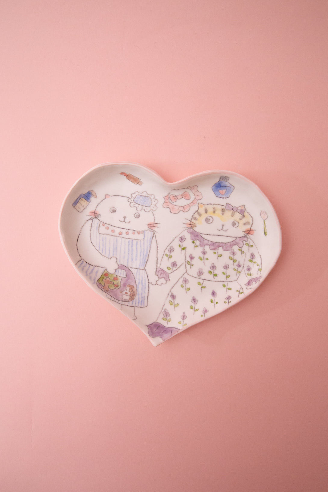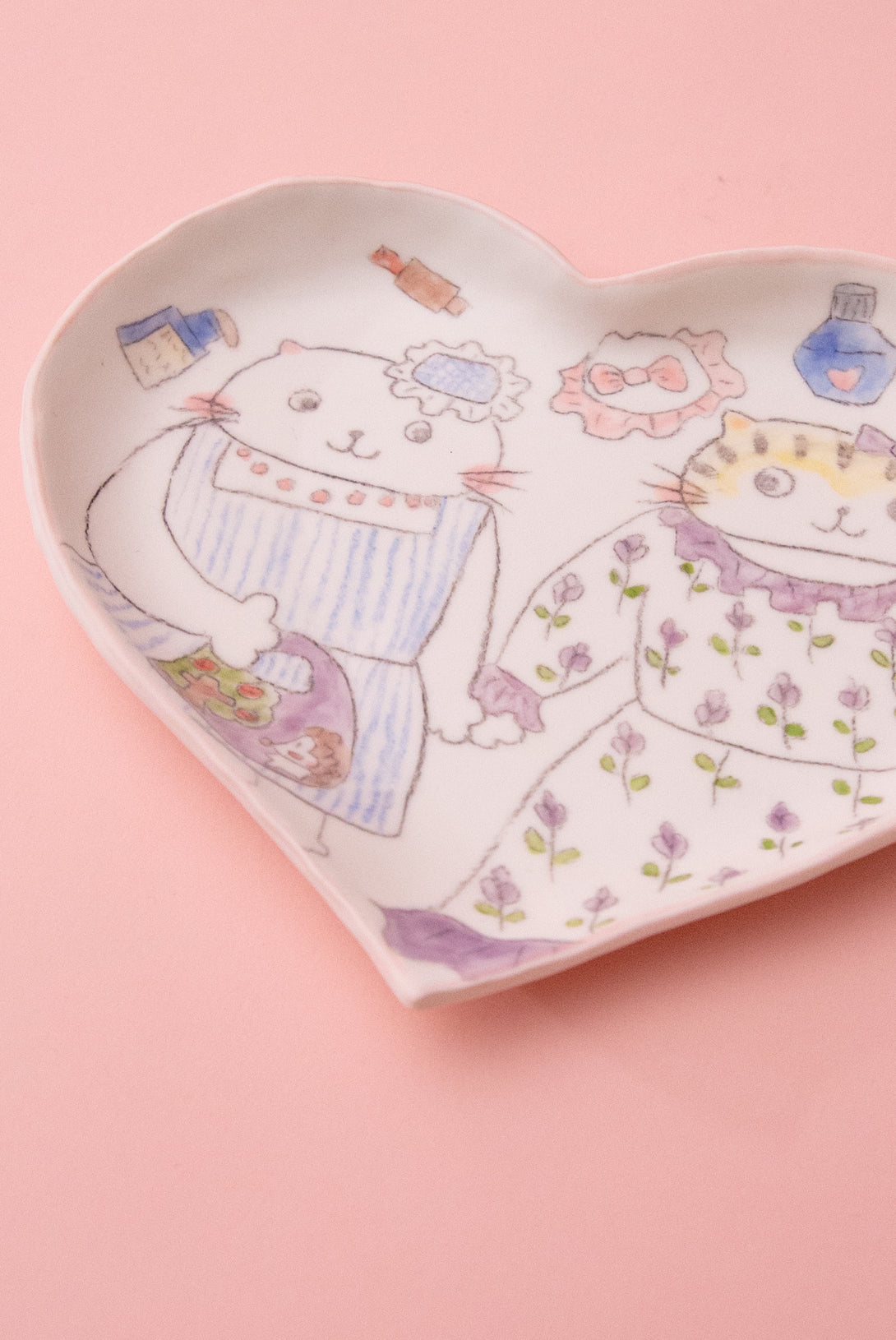 • Heart-shaped with a hand-painted design of two cats holding hands, surrounded by perfume bottles, flowers, and soft linework details.