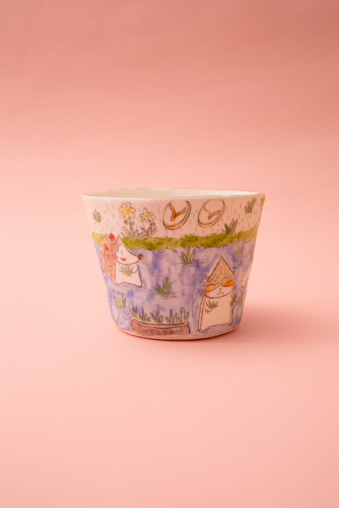 - Hedgegog planting grass. Doggo wears hats. A farmer cat harvests vegetables. There are floating lily pads, yellow flowers, and tiny sandals drying on the shore.